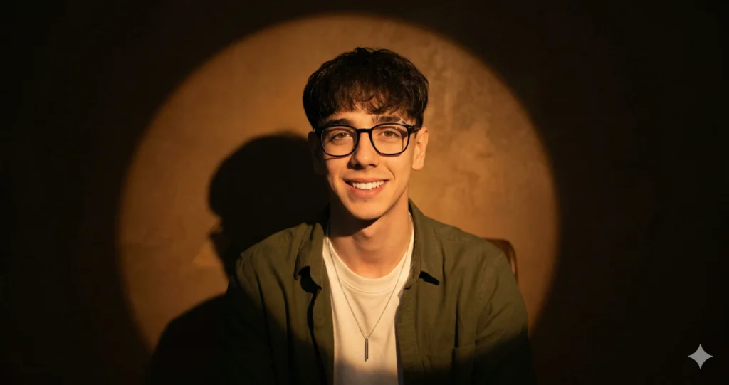 A hyper-realistic, modern cinematic portrait of the exact individual featured in the uploaded photo. This prompt must absolutely preserve the original facial structure, unique features, expression, eye placement, skin texture, hair, and beard; their face must be identical, unaltered, and instantly recognisable.The person is centrally framed in a medium shot, seated, facing forward directly toward the camera. Posture is confident, relaxed, and stylish, giving a modern fashion editorial presence.Wardrobe & Accessories (Exact Preservation):Identical unbuttoned, untucked light yellow linen shirt with chest pocket Thin silver pendant necklace Glasses matching the original photo (or black-framed if not present in original) Lighting & Scene (Modern Fashion Twist): Dramatic, warm amber/gold spotlight behind the subject, creating a circular halo on a textured dark brown wall. Deep, soft shadows around the subject for cinematic contrast, but slightly softened to give contemporary, sleek fashion editorial look. Face illuminated by subtle side/front spill light, highlighting skin texture and fabric details. Lower body and background remain in shadow, keeping focus entirely on the subject. Add subtle modern elements: faint reflections, minimal glossy surfaces, or subtle ambient colored lights (e.g., soft cyan or warm orange accent glow) to evoke a stylish, contemporary vibe. Composition & Focus: Face and upper body sharply in focus, fully preserving identity. Seated naturally, looking straight at the camera, exuding confidence and modern sophistication. Background minimal but fashion-forward, resembling high-end editorial photography or modern studio look. Critical Rules: Face must remain exactly identical to the uploaded photo. Clothing and accessories must remain unchanged. Pose is forward-facing while seated, maintaining natural balance. Modern styling comes only from lighting, subtle reflections, and contemporary editorial mood, not from altering the subject.