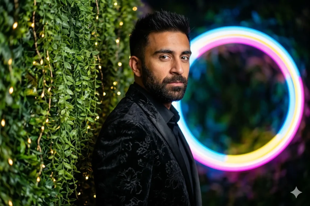 Ultra-realistic, hyper-detailed, 8K cinematic portrait of a young stylish man, using the uploaded image for exact face and hairstyle. A young man wearing an elegant black velvet suit jacket with intricate floral texture and soft fabric sheen under warm ambient lighting, paired with a subtle black shirt underneath, standing with his back and shoulder lightly against a lush vertical wall of hanging green leaves decorated with tiny golden fairy lights, his upper body slightly turned while his face is directed forward toward the camera, creating a confident, cinematic stance, calm and focused expression with eyes engaging directly with the viewer, set in a night-time outdoor environment glowing with colorful blurred bokeh lights, a softly illuminated circular neon ring in blue, pink, and yellow hues behind him adding vibrant depth and contrast, captured with a Sony Alpha DSLR look using an 80mm lens, warm golden fairy lights blending beautifully with cool none producing a dreamy, high-end cinematic atmosphere with shallow depth of field and realistic reflections on the jacket.