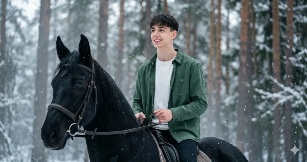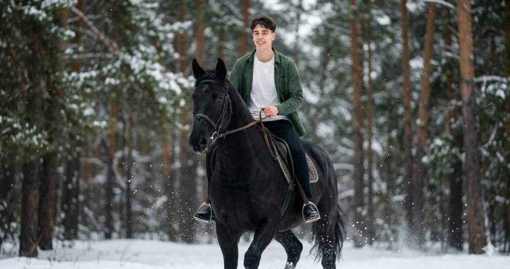 The black horse should appear powerful, elegant, and well-groomed, with detailed fur texture, natural muscle structure, and a slightly snowy mane. The horse is wearing a dark leather bridle with visible straps and metal rings, and the reins extend naturally to the subject’s gloved hand.